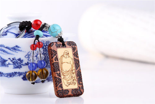 Two Kinds Wood Inlay Carving Chinese Maitreya Buddha Sculpture Pendant Key Chain