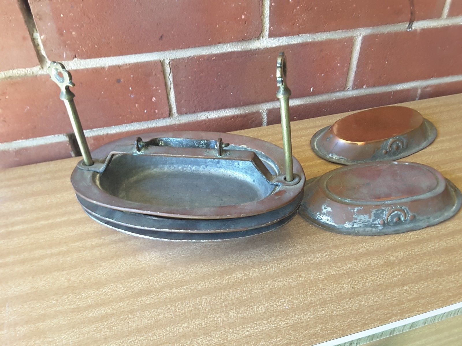 Antique Hand Made Set THREE Copper PANS LID BRASS RACK