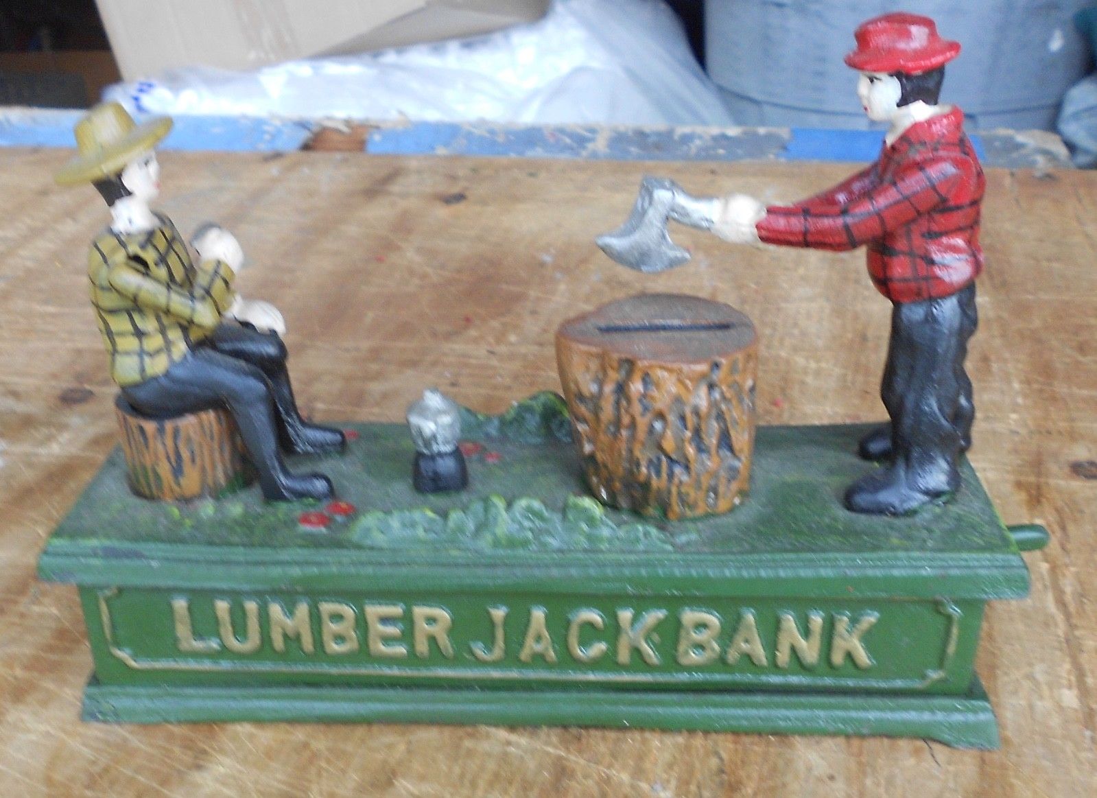 Title (ebay affiliate link): Vintage Cast Iron Lumber Jacks Bank Mechanical Piggy Banks