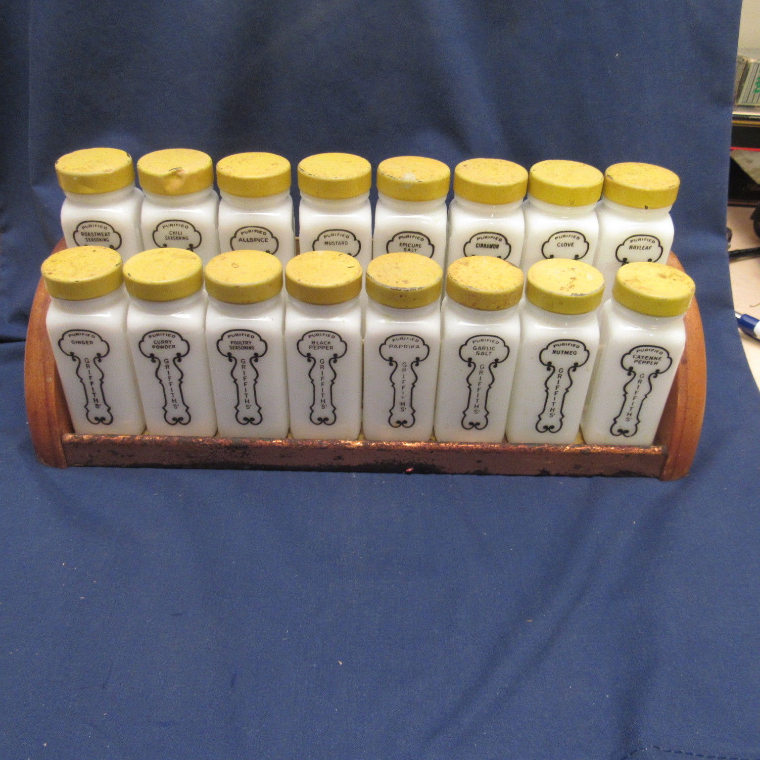 VINTAGE "GRIFFITH''S " 16 MILK GLASS SPICE JARS & RACK