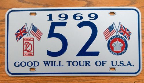 Rolls Royce Owners Club / 20 Ghost Club License Plate -1969 Goodwill Tour of USA