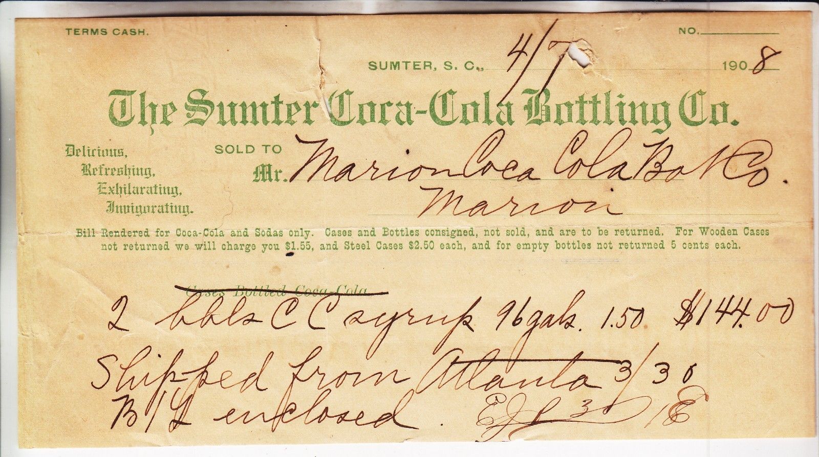 THE SUMTER COCA-COLA BOTTLING CO. INVOICE DATED 4/7 1908 110 YEARS OLD