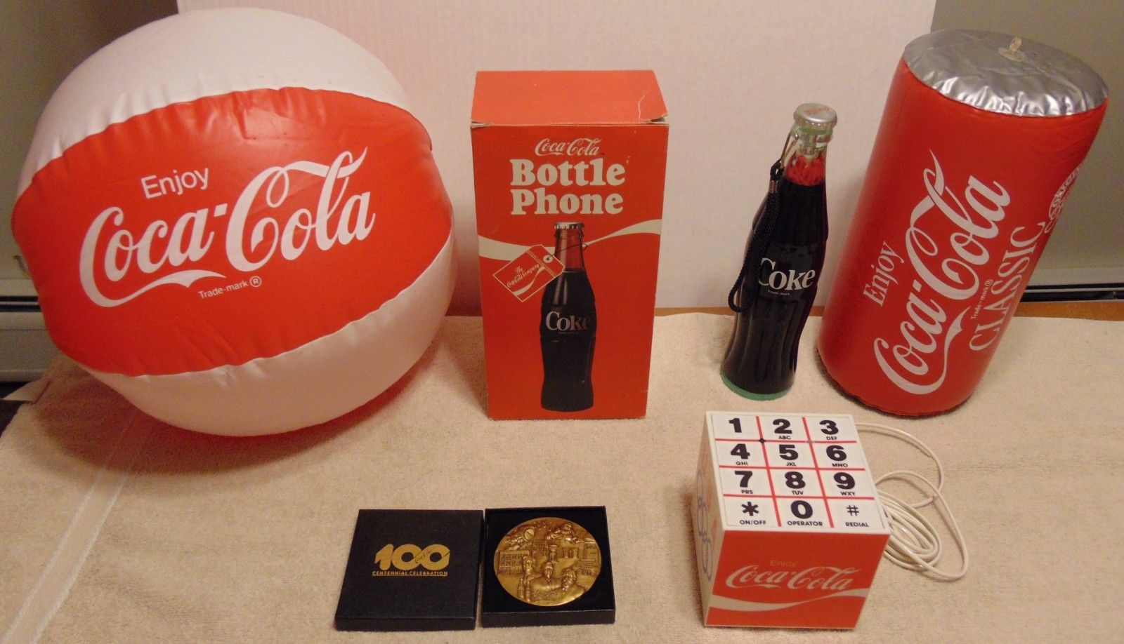 Title (ebay affiliate link): Lot of Mixed Coca-Cola Collectibles. Phones, Umbrella, Medallion, Inflatables.