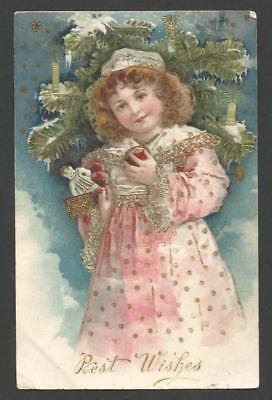 T03 - GIRL WITH APPLE, TOYS & CHRISTMAS TREE - 1905 EDWARDIAN EMBOSSED POSTCARD