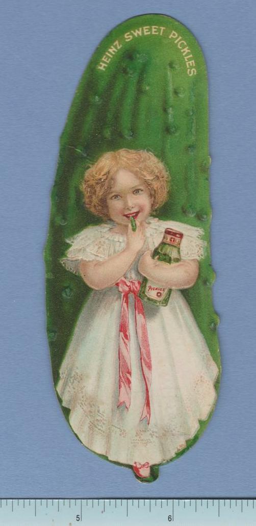 Title (ebay affiliate link): H.J. Heinz Pittsburgh PA Die-Cut Sweet Pickle Trade Card ~ Girl Holds Pickle Jar