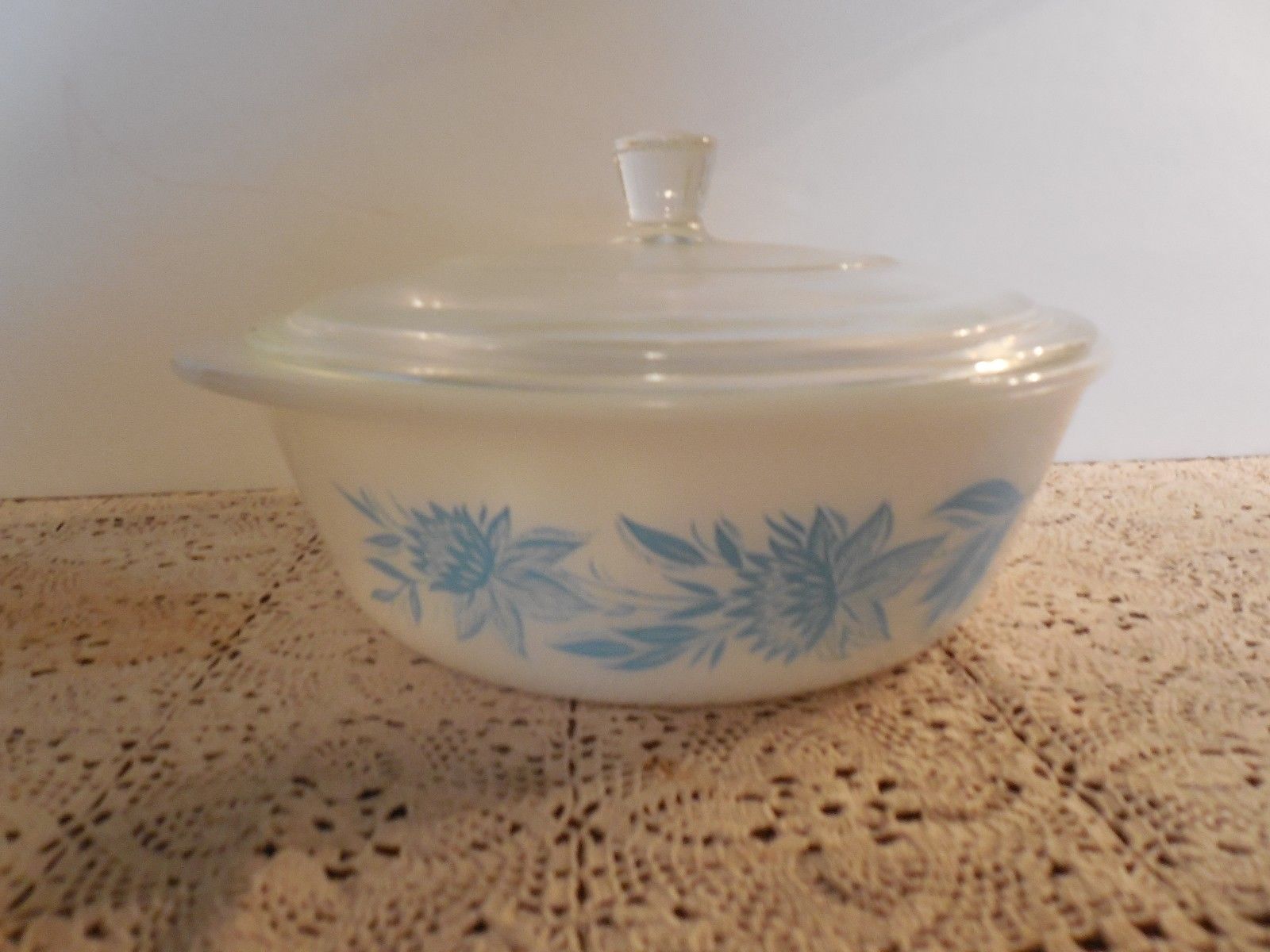 Title (ebay affiliate link): Jeannette Glass Co GlasBake 2 Qt Blue Thistle Milk Glass Casserole w/Lid