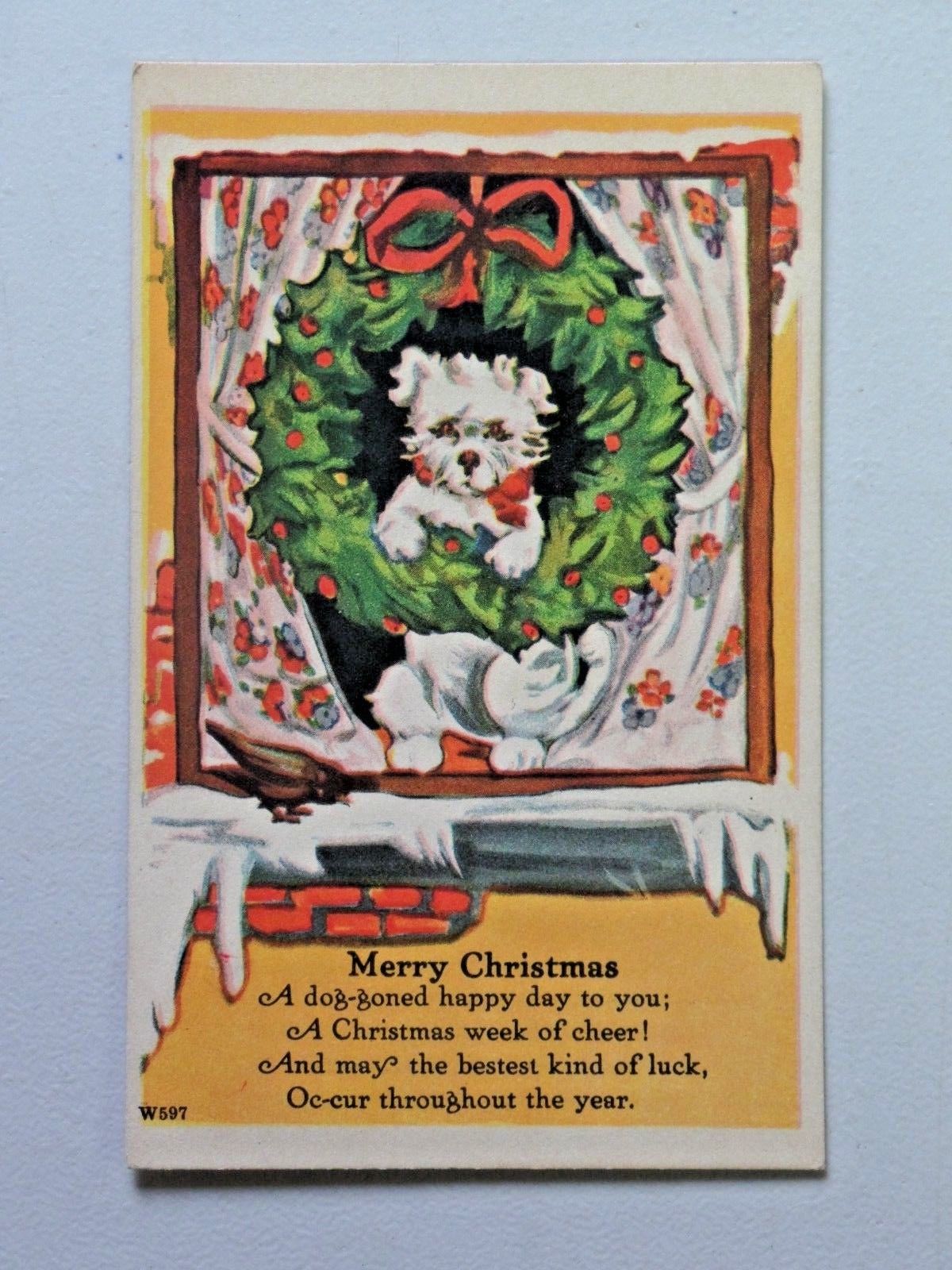 Title (ebay affiliate link): Vtg. Merry Christmas Postcard Cute Dog in Wreath in Window Unposted 3287