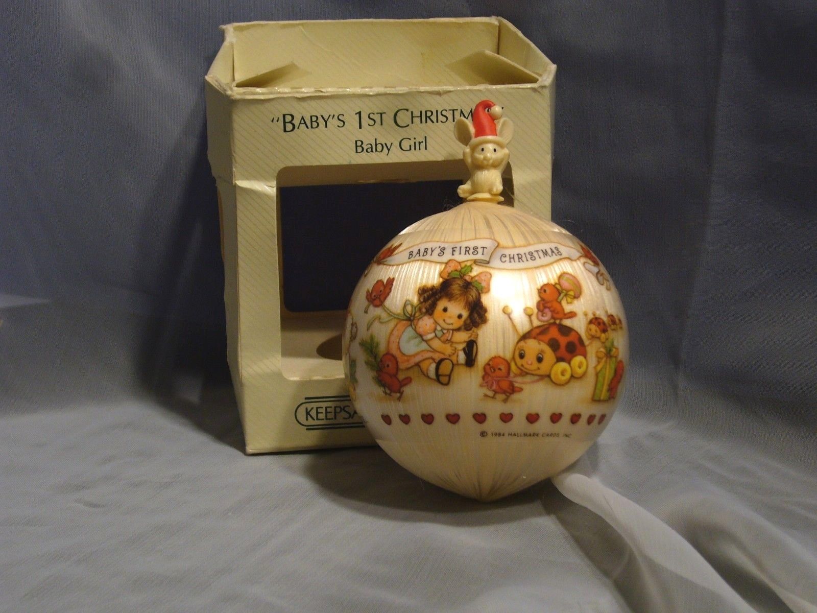 Title (ebay affiliate link): VINTAGE HALLMARK 1984 BABY''S FIRST CHRISTMAS "GIRL" SATIN BALL ORNAMENT