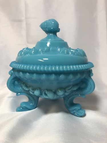 Title (ebay affiliate link): Westmoreland blue milk glass seashell nautcial footed candy dish dolphin accents