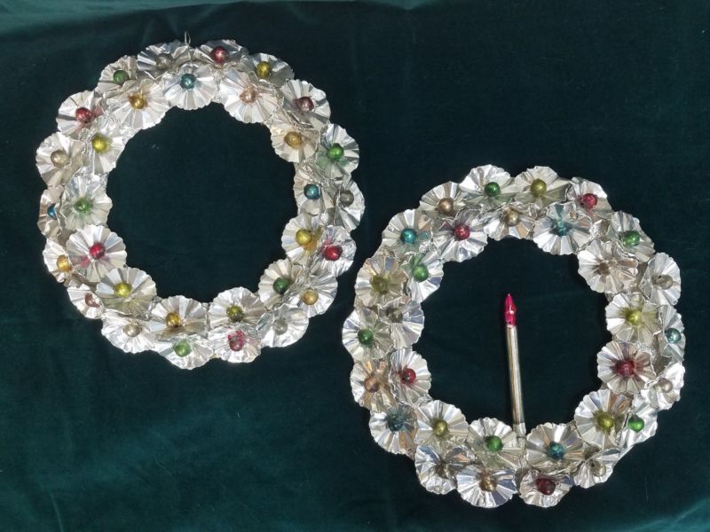 Title (ebay affiliate link): Vintage two Christmas SILVER FOIL ROSETTES & Glass Balls 10" Wreaths holiday