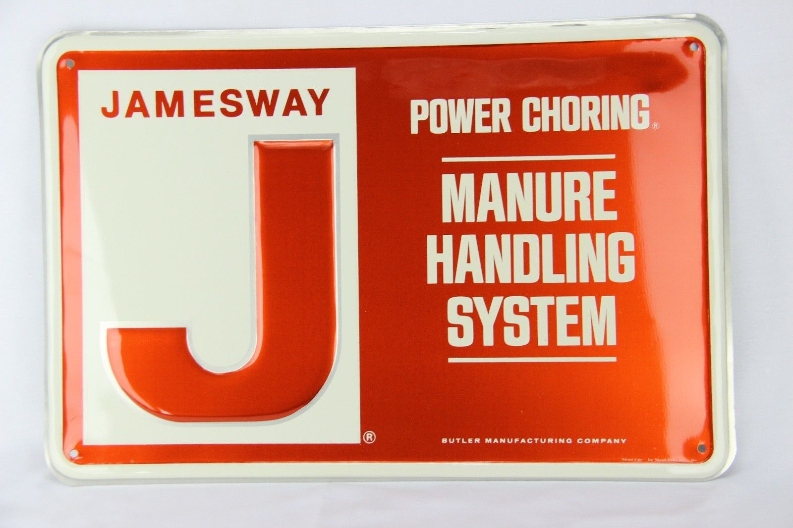 VINTAGE JAMESWAY FARM BARN EQUIPMENT EMBOSSED TIN ADVERTISING SIGN MANURE