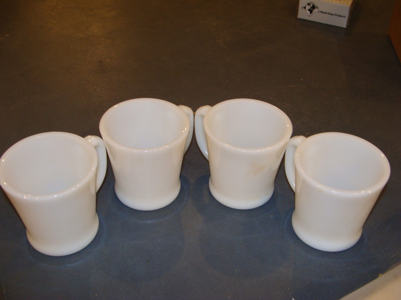 Title (ebay affiliate link): SET OF FOUR VINTAGE "FIRE KING" COFFEE CUPS / WHITE MILK GLASS / "D" HANDLE
