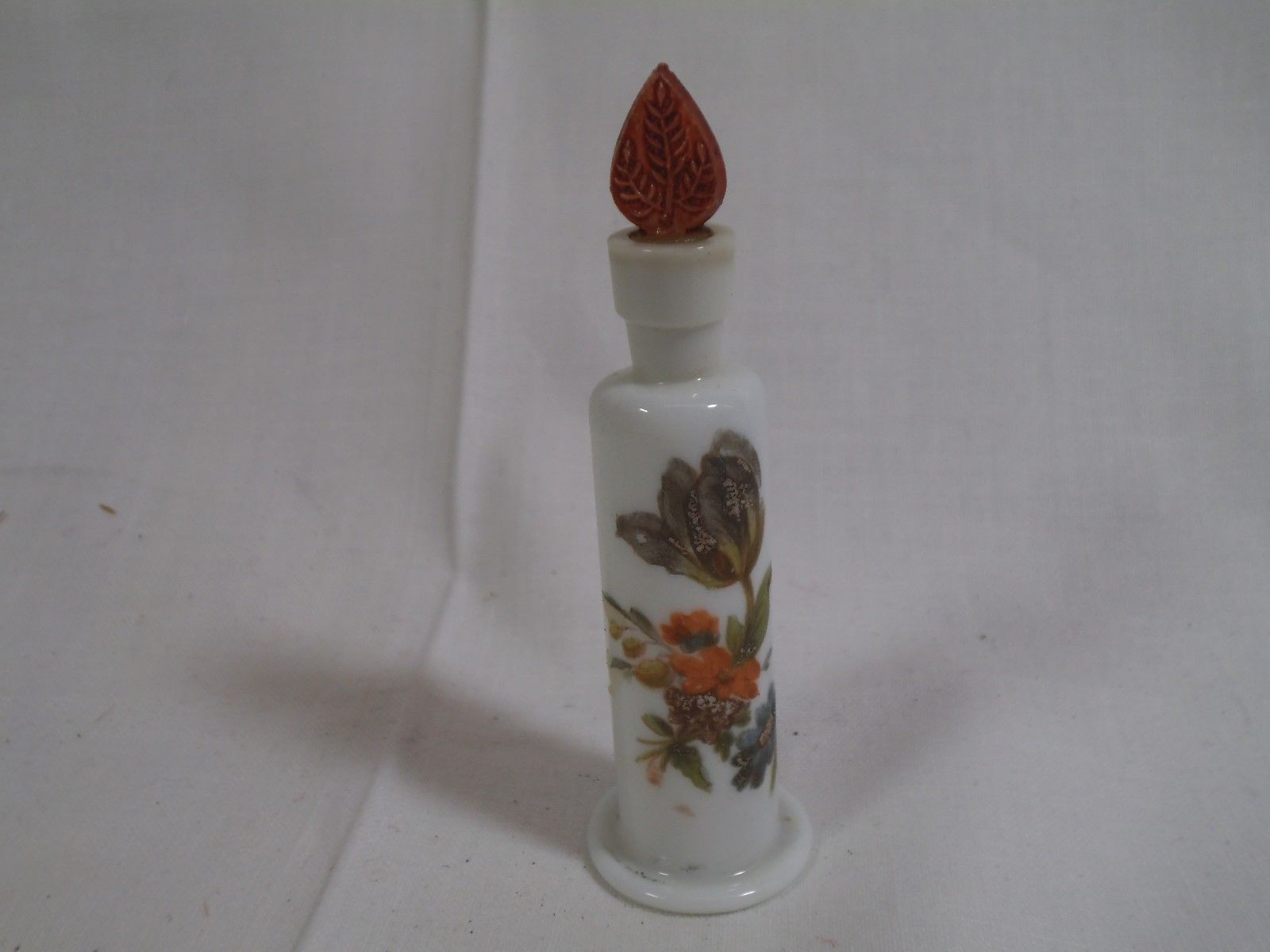 Title (ebay affiliate link): Vintage White Milk Glass Candle Shaped Perfume Bottle - Floral Painted