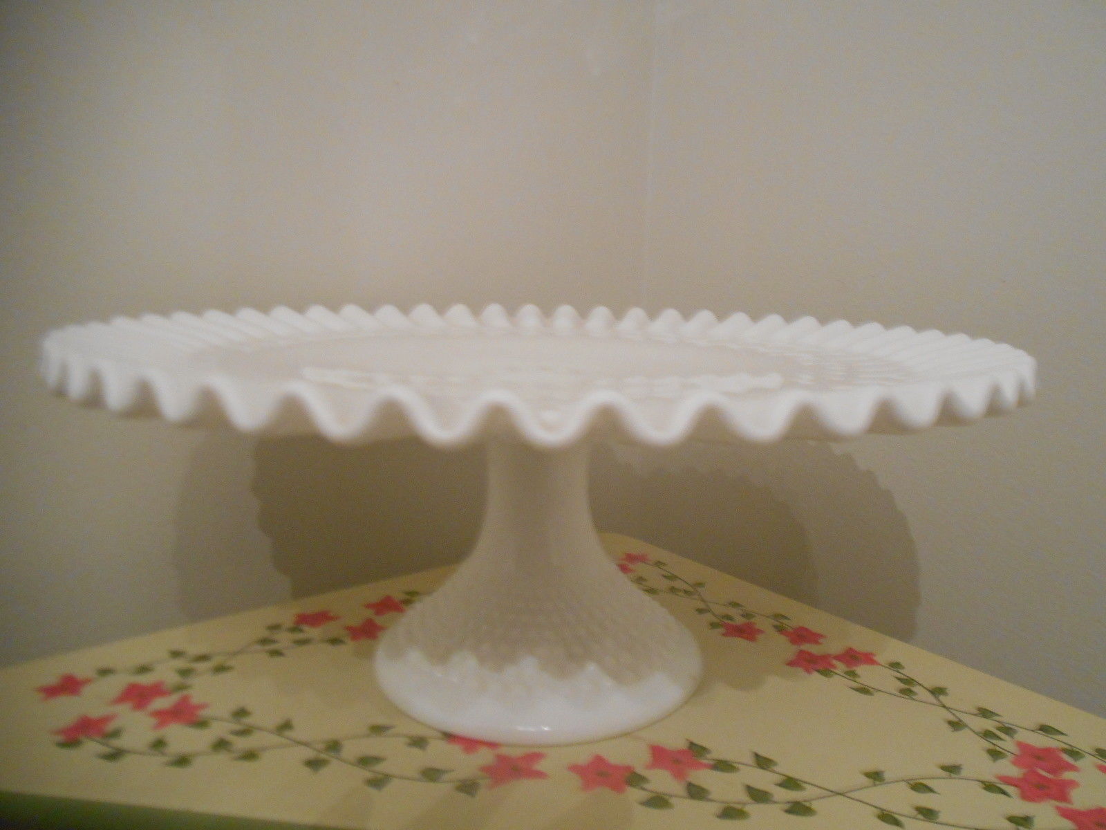 Title (ebay affiliate link): Large Sighed FENTON Pedestal Cake Stand Dish Plate White Milk Glass