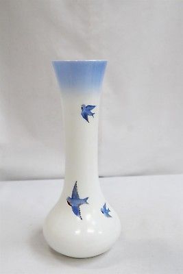 Arts Crafts Blue birds in Flight Milk Glass Bulbous Long Neck Vase