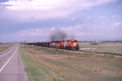 ORIGINAL KODACHROME CPR TRAIN # 858 SD40 # 5826 FORT MACLEOD, ALBERTA 1987