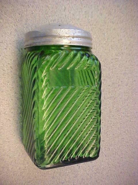 Title (ebay affiliate link): VINTAGE FOREST GREEN DEPRESSION GLASS SALT SHAKER WITH SWIRL PATTERN-ORG. LID