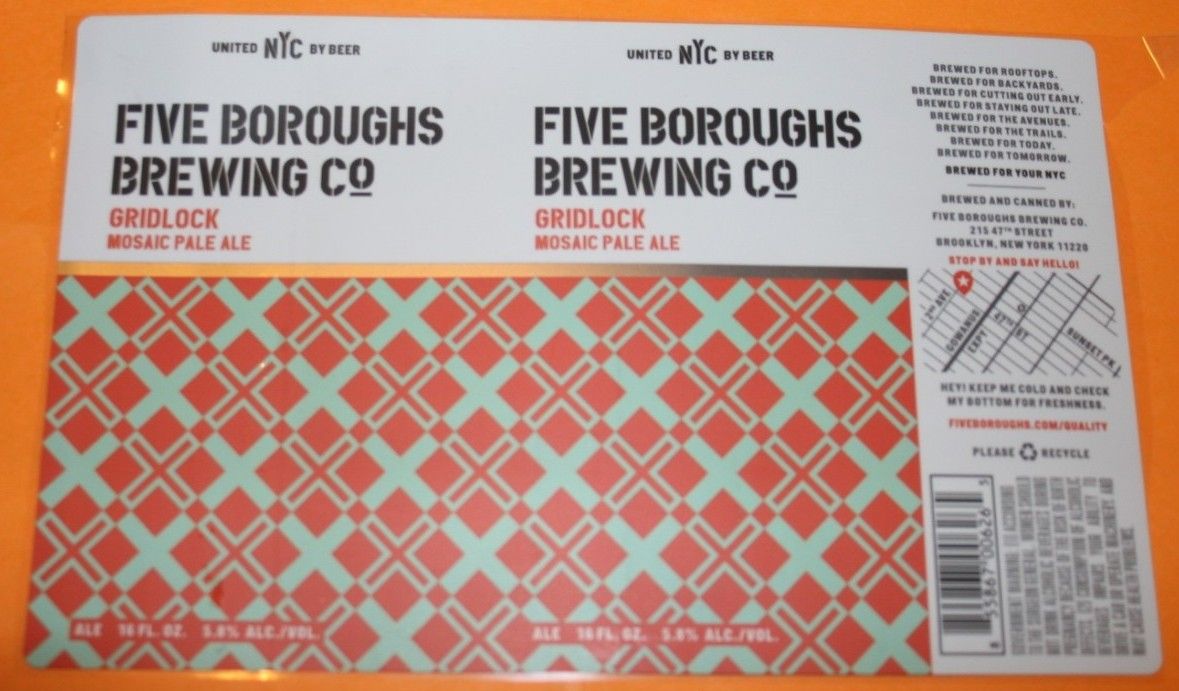 Title (ebay affiliate link): FIVE BOROUGHS BREWING "GRIDLOCK" MOSAIC PALE ALE UNUSED LABEL