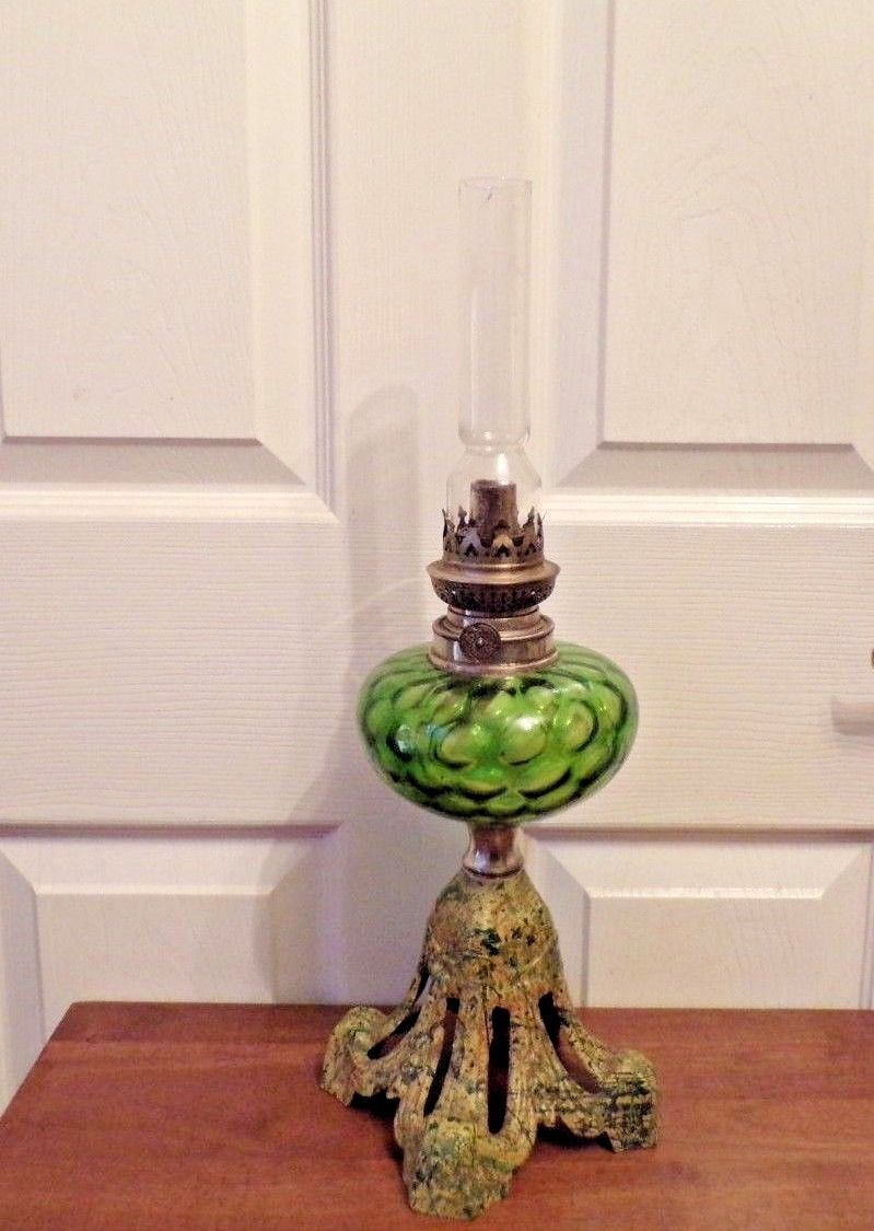Vintage Kosmos oil lamp & Dark green glass font ornate cast iron base working