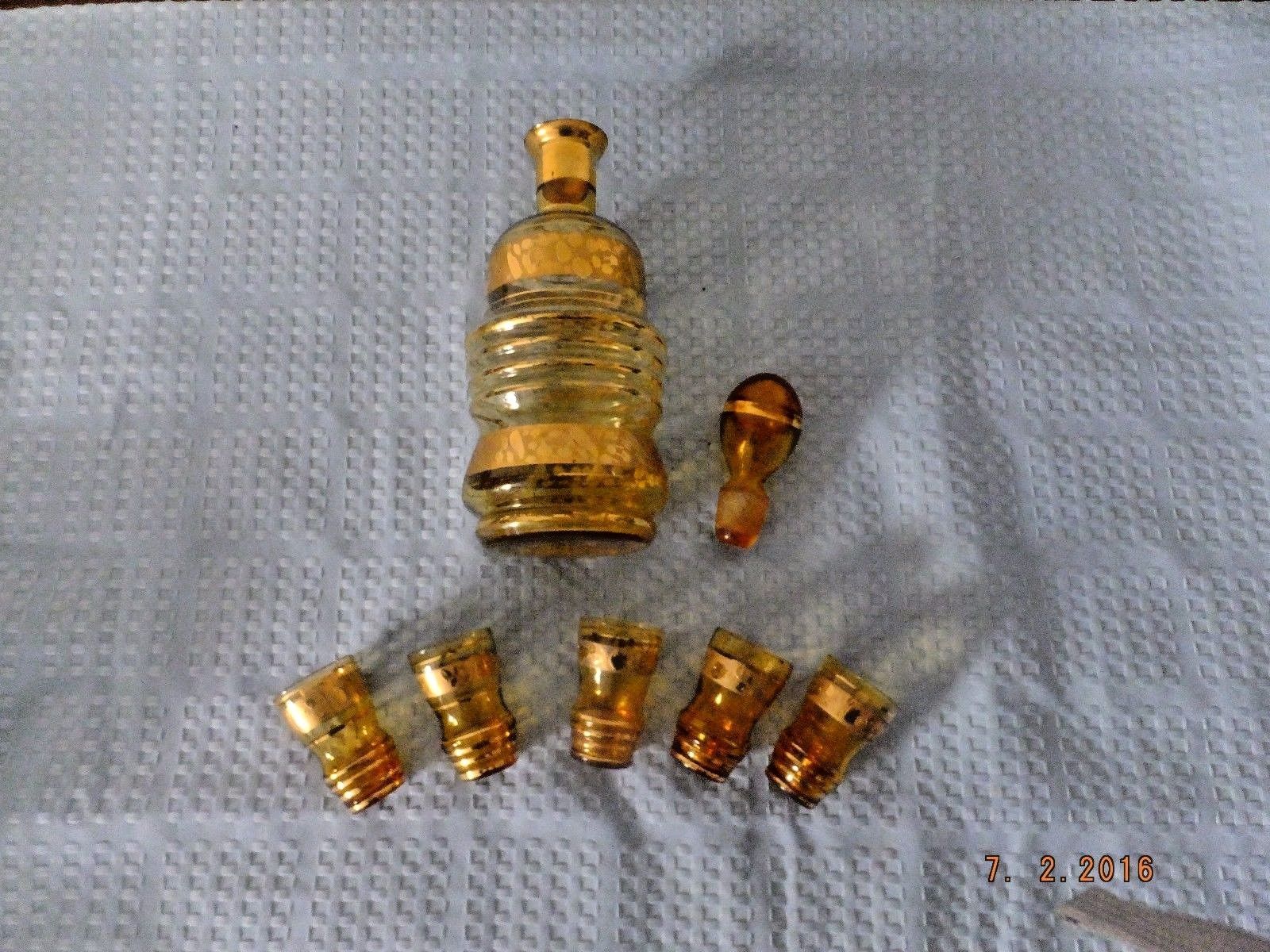 Yellow Glass Decanter, Stopper and Five Glasses Gold Design