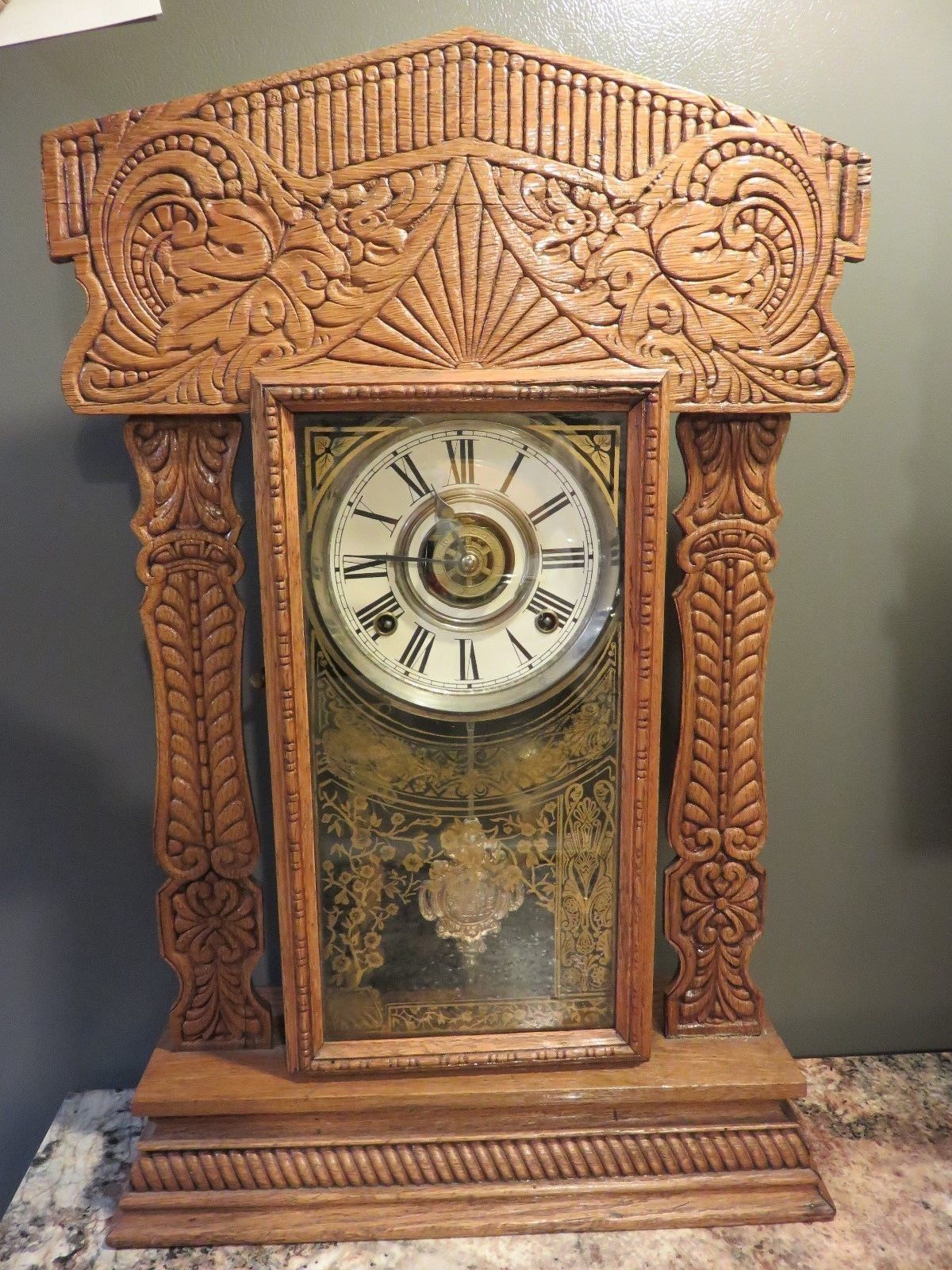 Title (ebay affiliate link): CHARMING ANTIQUE 19TH CENTURY WILLIAM GILBERT OAK GINGERBREAD MANTEL CLOCK WORKS