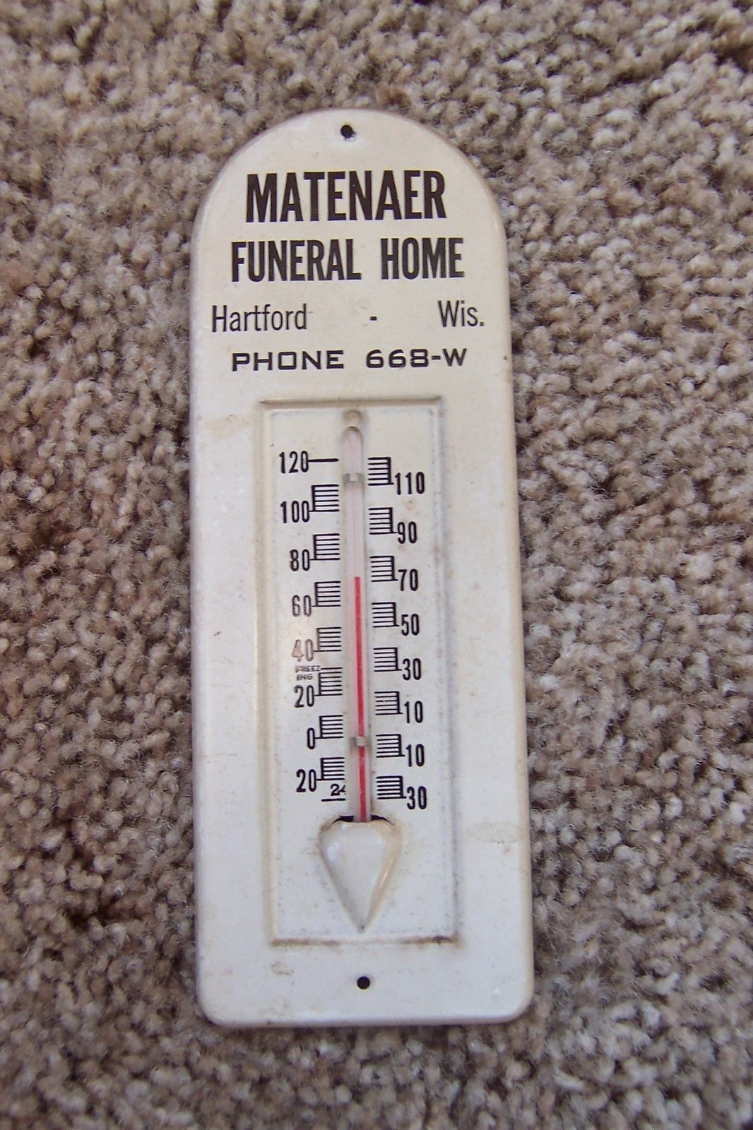 VINTAGE THERMOMETER, MATENAER FUNERAL HOME, HARTFORD, WISC