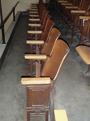 Title (ebay affiliate link): ANTIQUE Wooden Theater chairs cast iron seats SET OF 4