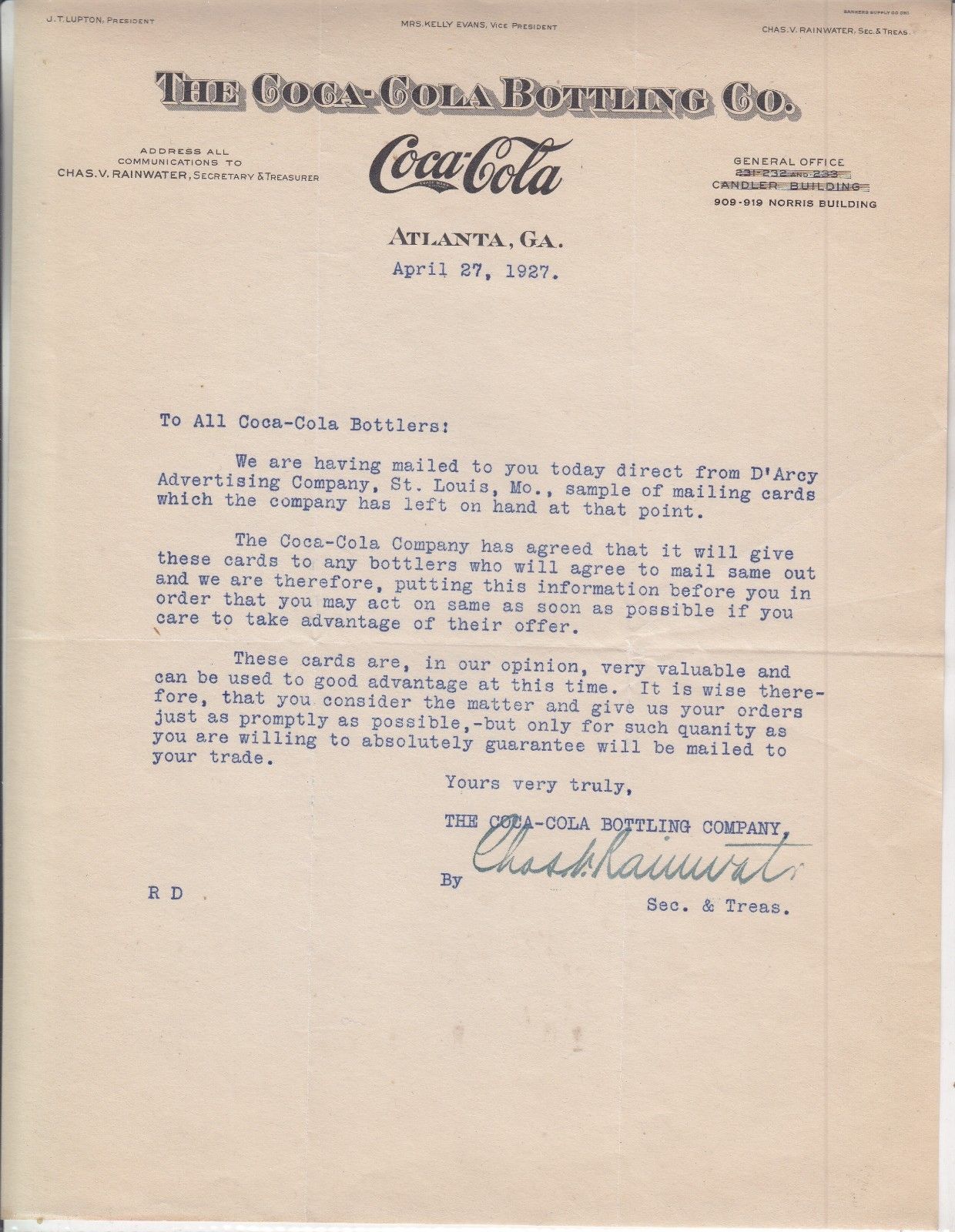 Title (ebay affiliate link): THE COCA-COLA BOTTLING COMPANY ATLANTA GA. LETTERHEAD DATED APRIL 27, 1927