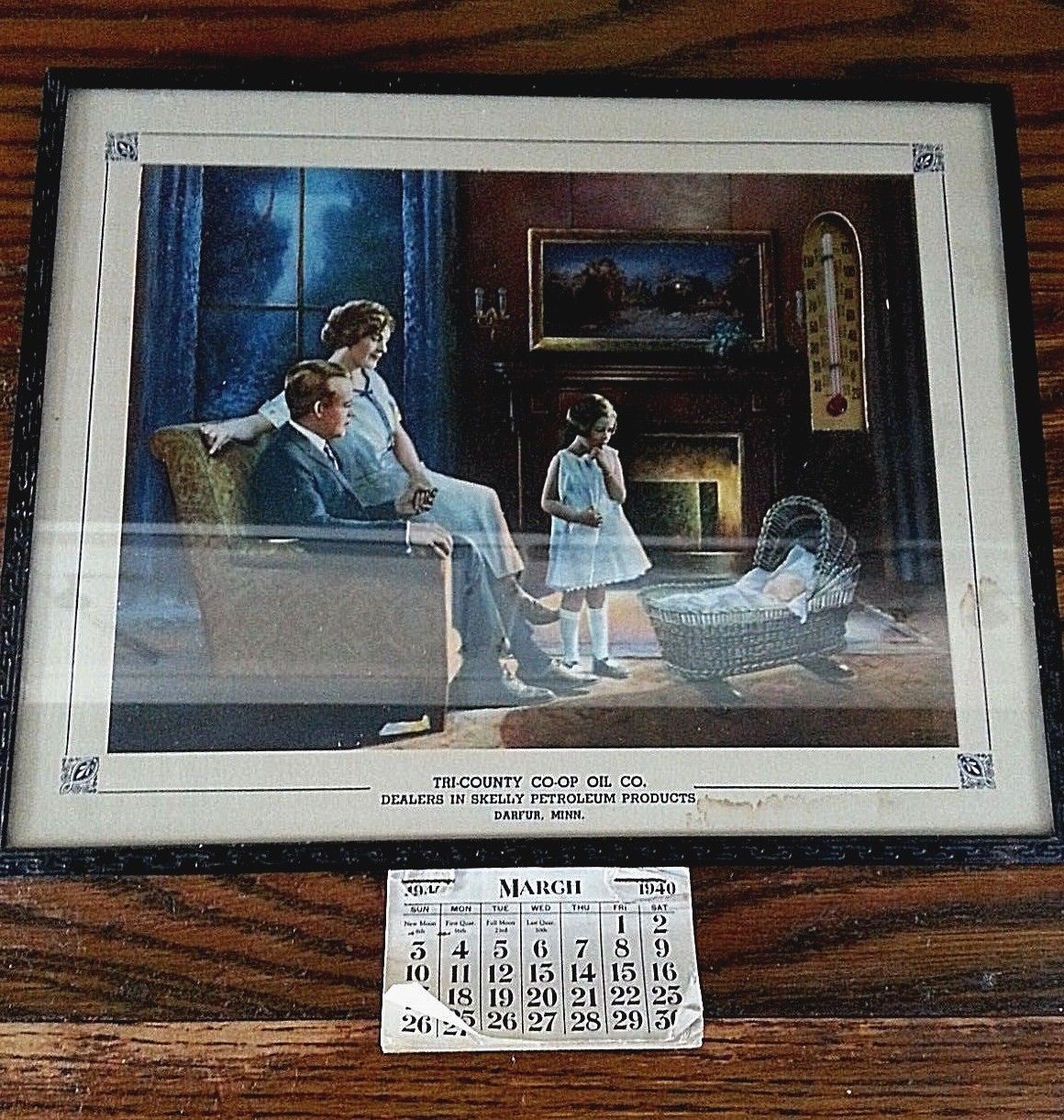 1940 Tri-County Co-op Oil Calendar Thermometer Darfur MN Skelly Petroleum Print