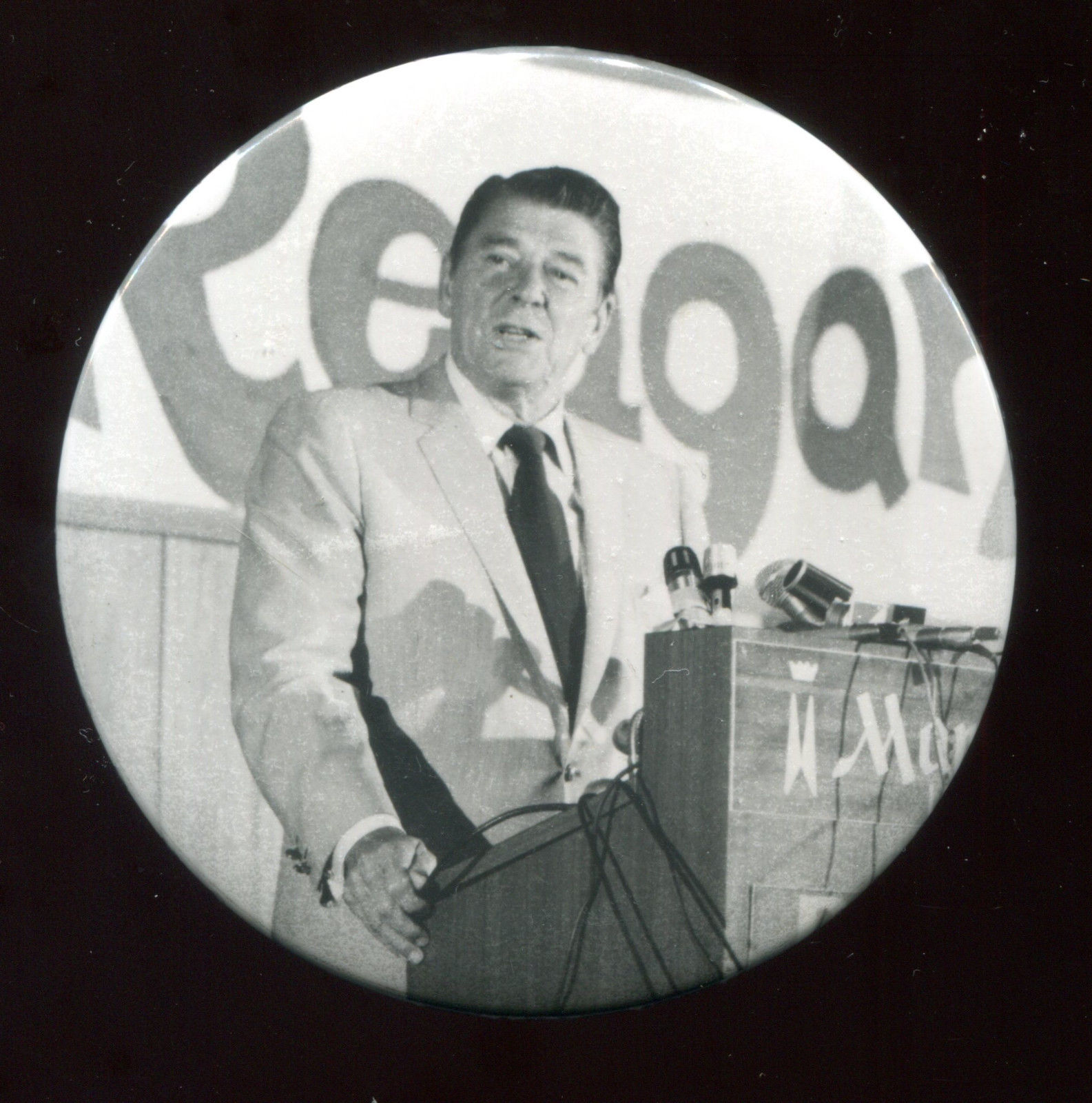 Title (ebay affiliate link): Reagan at Podium, Black and White Photo Button