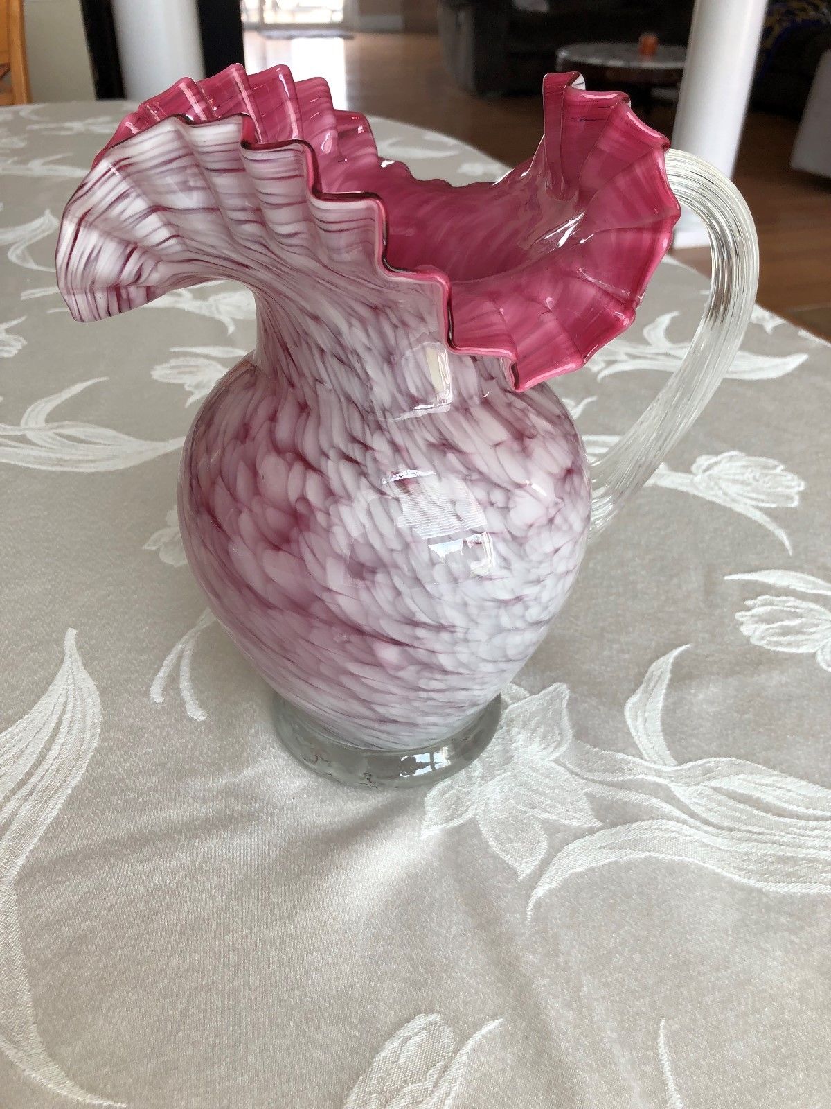 Title (ebay affiliate link): ANTIQUE CRANBERRY AND WHITE SPATTER RUFFLED PITCHER WITH REEDED HANDLE PHOENIX?