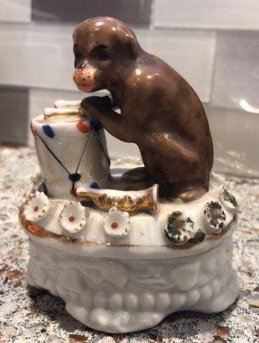 Antique Porcelain Fairing Box Monkey Playing A Drum