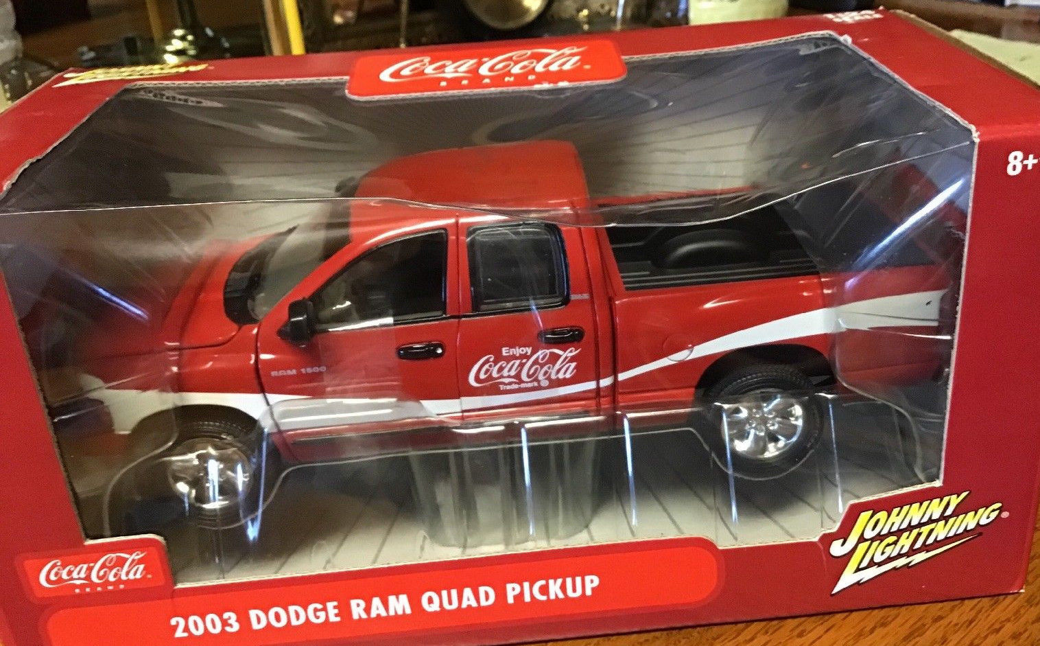 Title (ebay affiliate link): BRAND NEW Johnny Lightning Coca Cola 1:24 Scale 2003 Dodge Ram Quad Pickup Truck