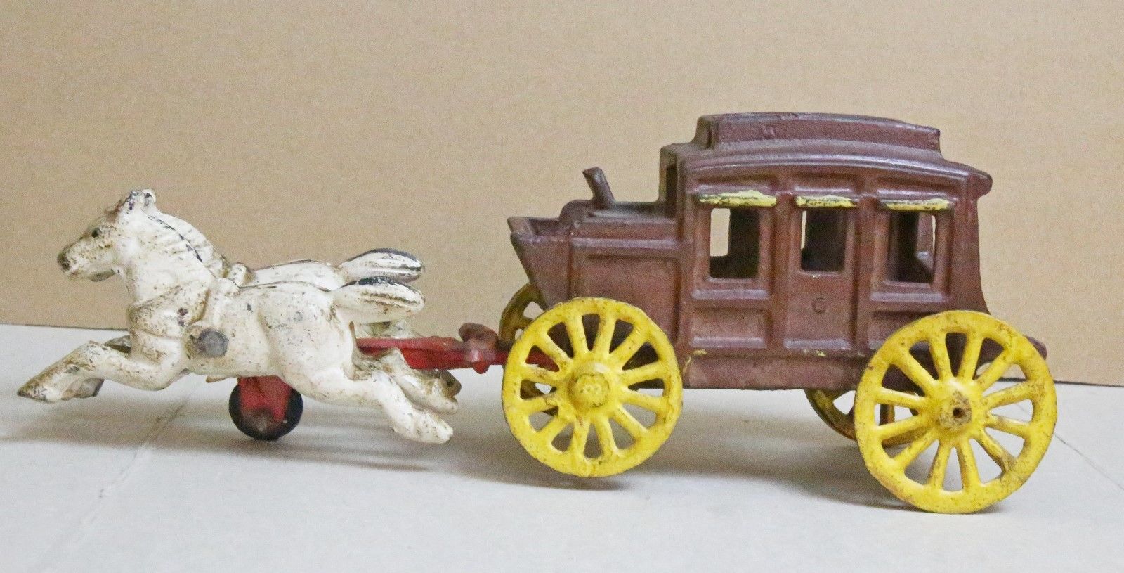 Title (ebay affiliate link): Cast iron stage coach toy, vintage, two horses, western, 1930s