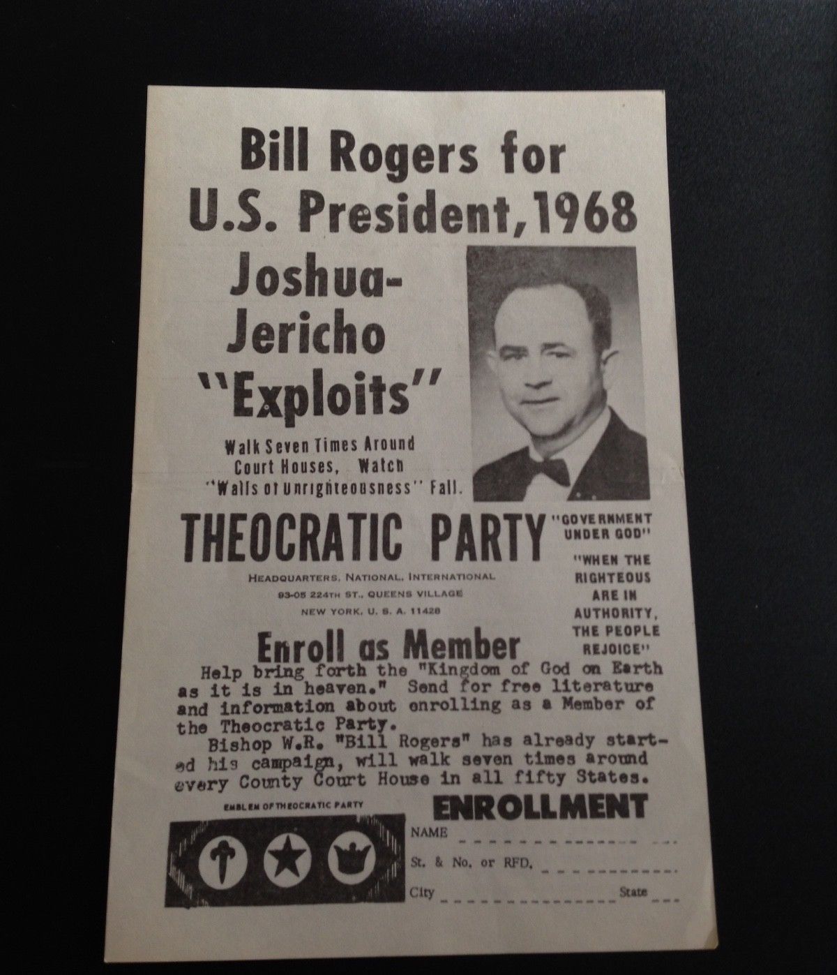 Title (ebay affiliate link): 1968 Bill Rogers Theocratic Party Presidential campaign flyer.