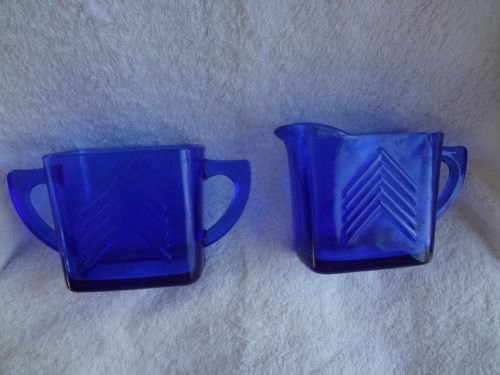 Title (ebay affiliate link): Vintage Hazel Atlas Chevron Cobalt Blue Depression Glass Creamer and Sugar
