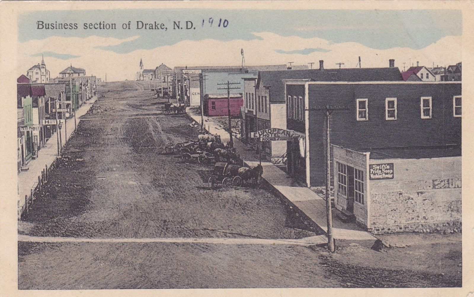 post card size BUSINESS SECTION of Drake North Dakota 1910? Towner ND