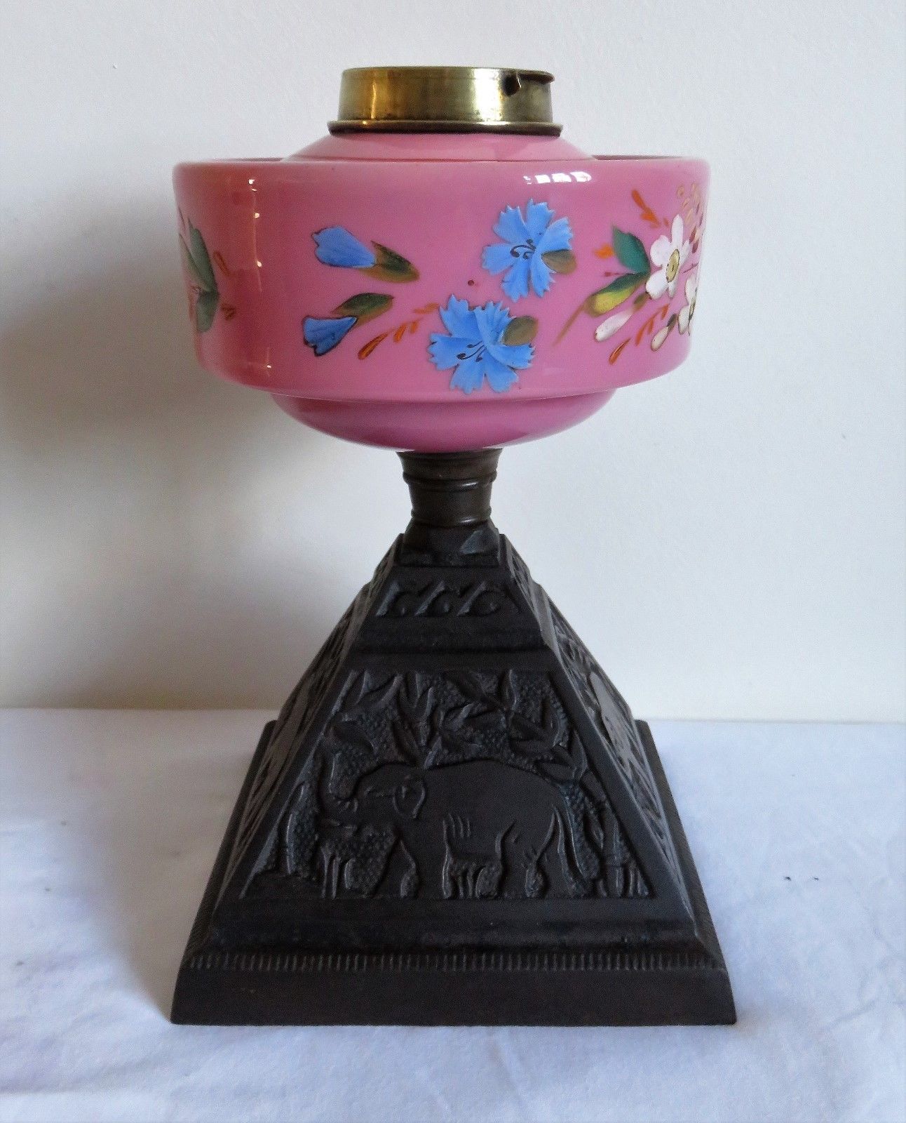 Victorian Oil Lamp with Hand Painted Glass Reservoir & Elephant Design Cast Base