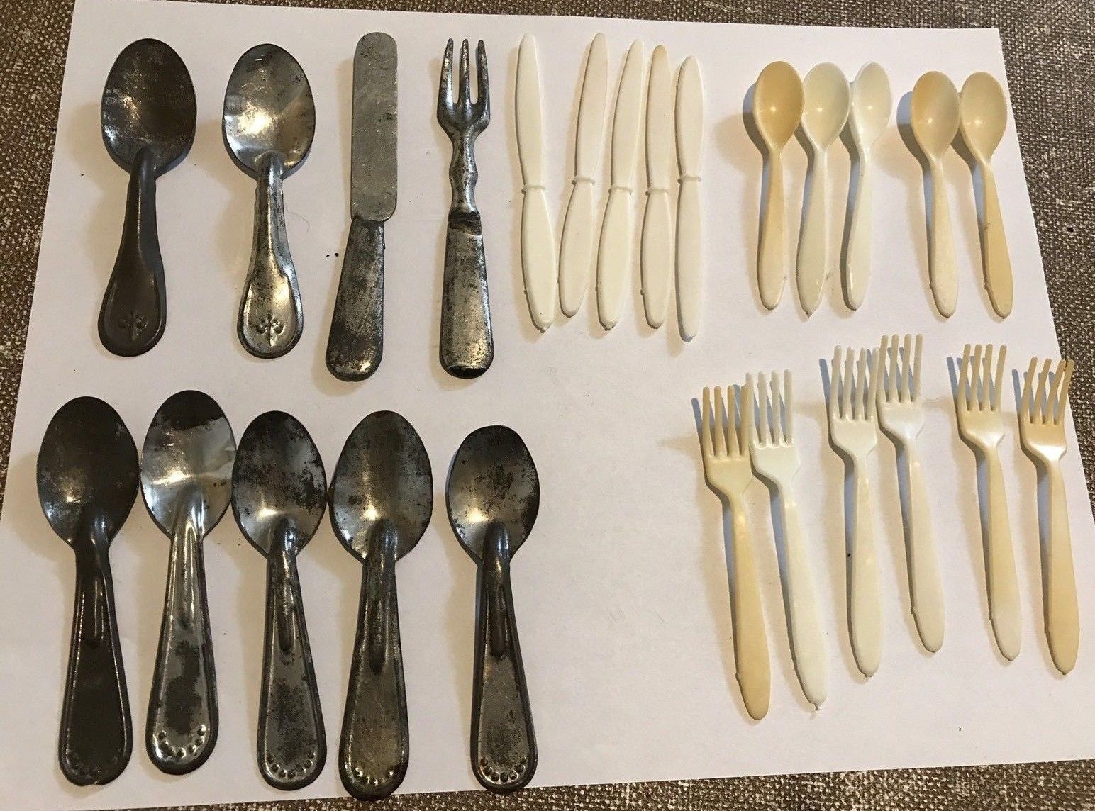 Title (ebay affiliate link): Lot 25 Miniature Tin Plastic Spoons Knives Forks Childs Tea Party Doll House