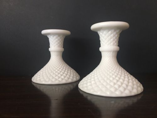 Title (ebay affiliate link): Antique White Milk Glass Diamond Point Candle Holders Candlesticks