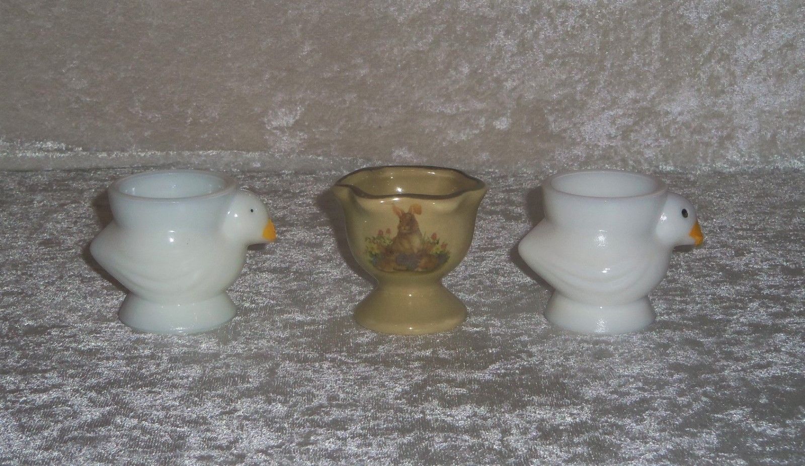 Title (ebay affiliate link): Mixed Lot 3 Vintage OPALEX Milk Glass Chick Chicken & Bunny Rabbit Egg Cups