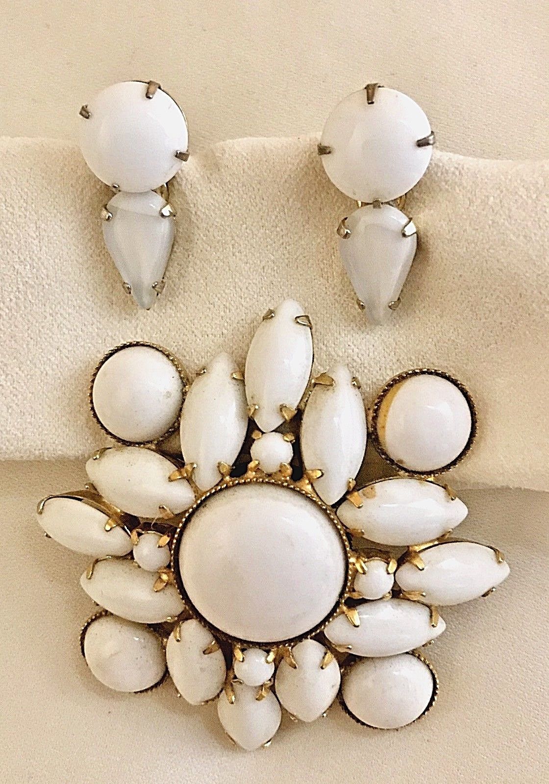 Title (ebay affiliate link): Vintage Estate Milk Glass Prong Set Brooch And Clip Earrings Open Back Stones