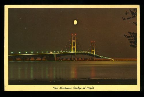 Title (ebay affiliate link): MICHIGAN POSTCARD: MOON OVER THE MACKINAC BRIDGE AT NIGHT