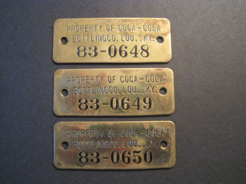 Title (ebay affiliate link): Three Vintage Property of Coca-Cola Louisville, Kentucky Brass Tags