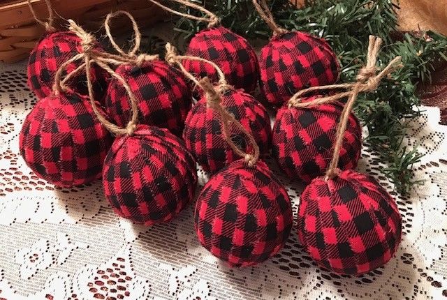 Title (ebay affiliate link): 10 BUFFALO Christmas Plaid Fabric Rag Balls Farmhouse Primitive Ornaments A86