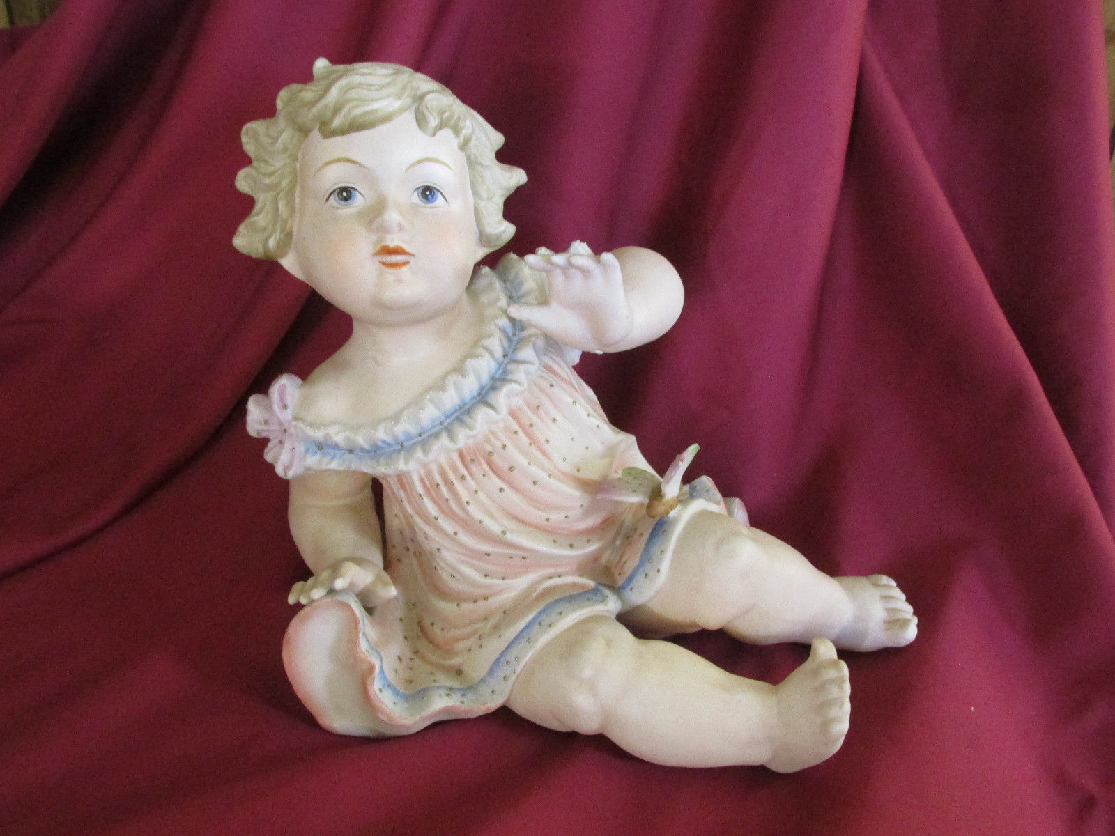 Title (ebay affiliate link): SOLID BISQUE 9" FEMALE TODDLER PIANO BABY PINK BLUE DRESS BUTTERFLY UNMARKED