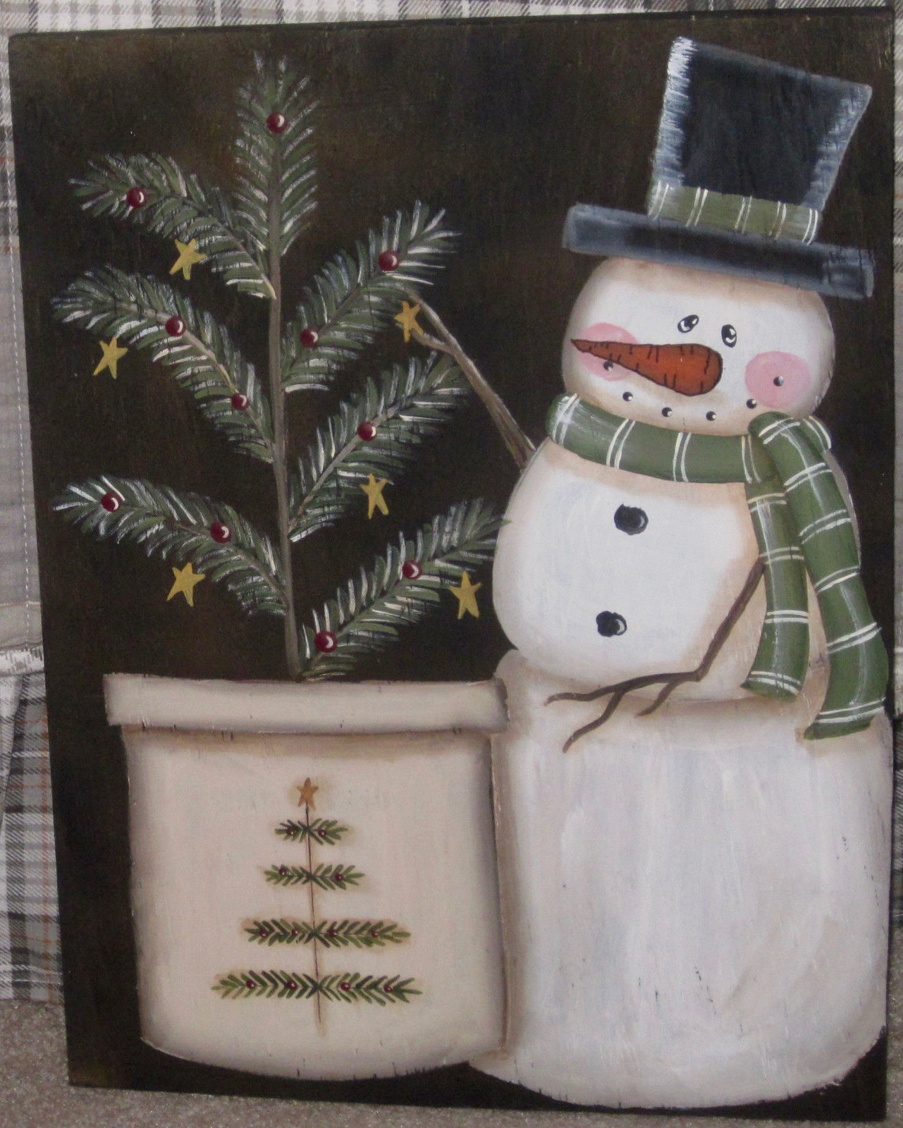 *~*PRIMITIVE*~* HP FOLK ART PRIM SNOWMEN *~* CROCK W/TREE *~* BOARD