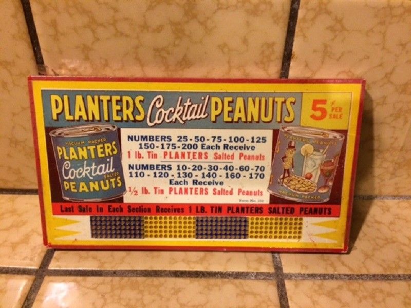 Title (ebay affiliate link): Vintage Mr. Peanut Planters Punch Board Cocktail Peanuts Unwrapped 5 Cents