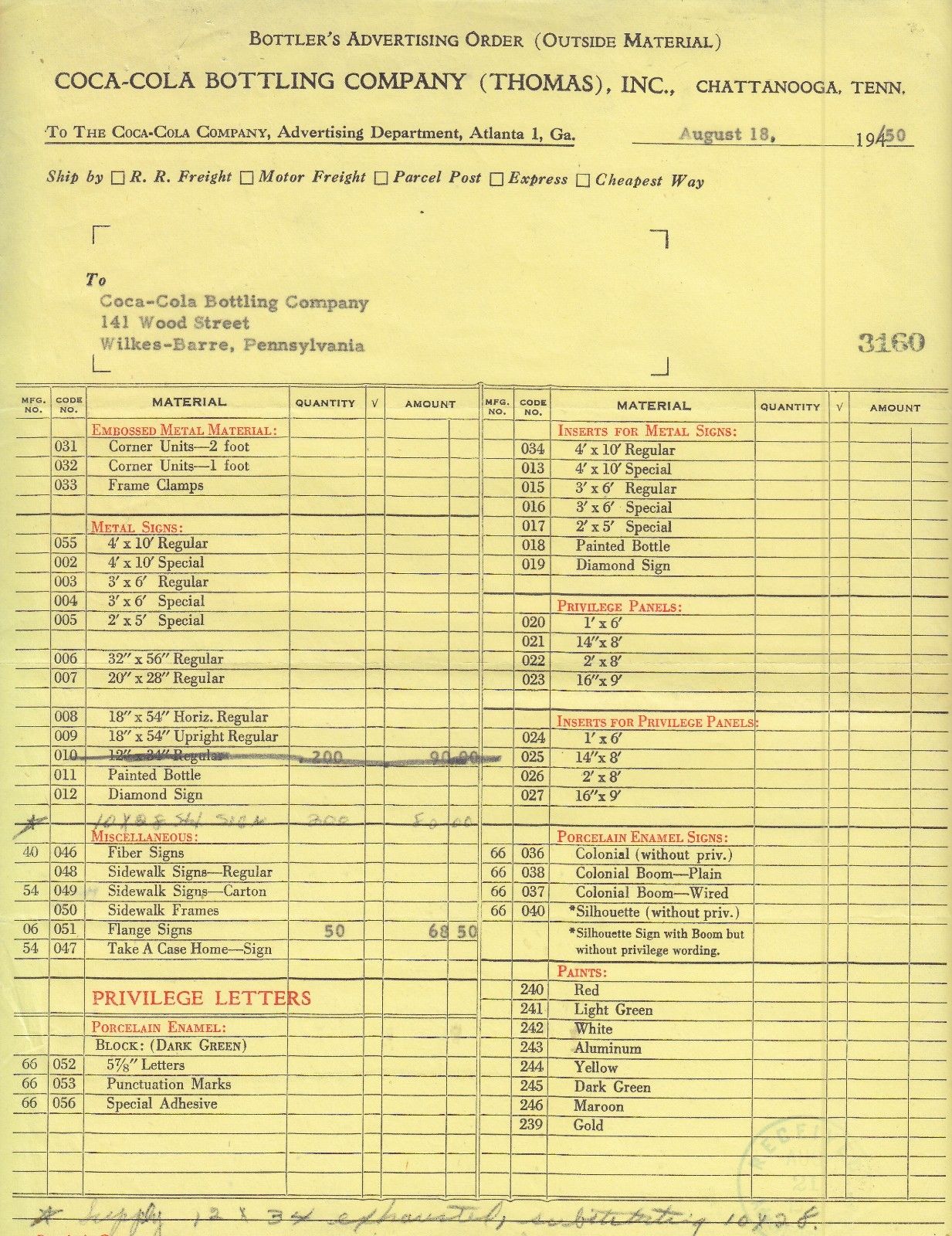 Title (ebay affiliate link): THE COCA-COLA BOTTLING CO.(THOMAS). inc. ADVERTISING ORDER DATED AUG. 18, 1950