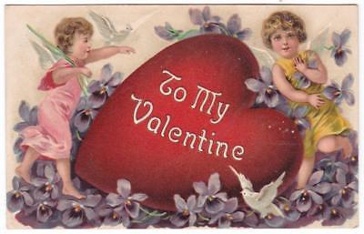 Title (ebay affiliate link): Valentine embossed postcard ~ big red heart white dove bird cupids series 256